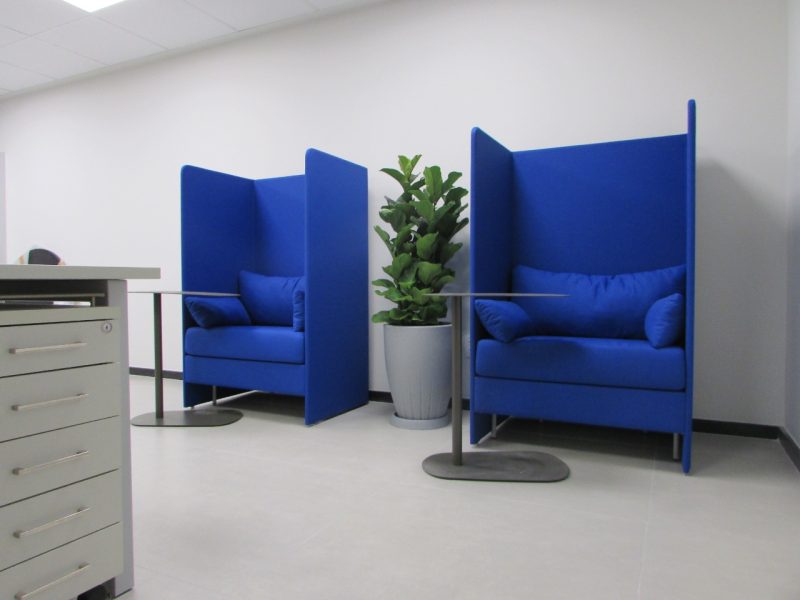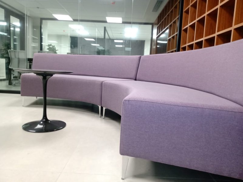 🎨 Sofás Curve, com design moderno e cores vibrantes, criando áreas colaborativas e cheias de